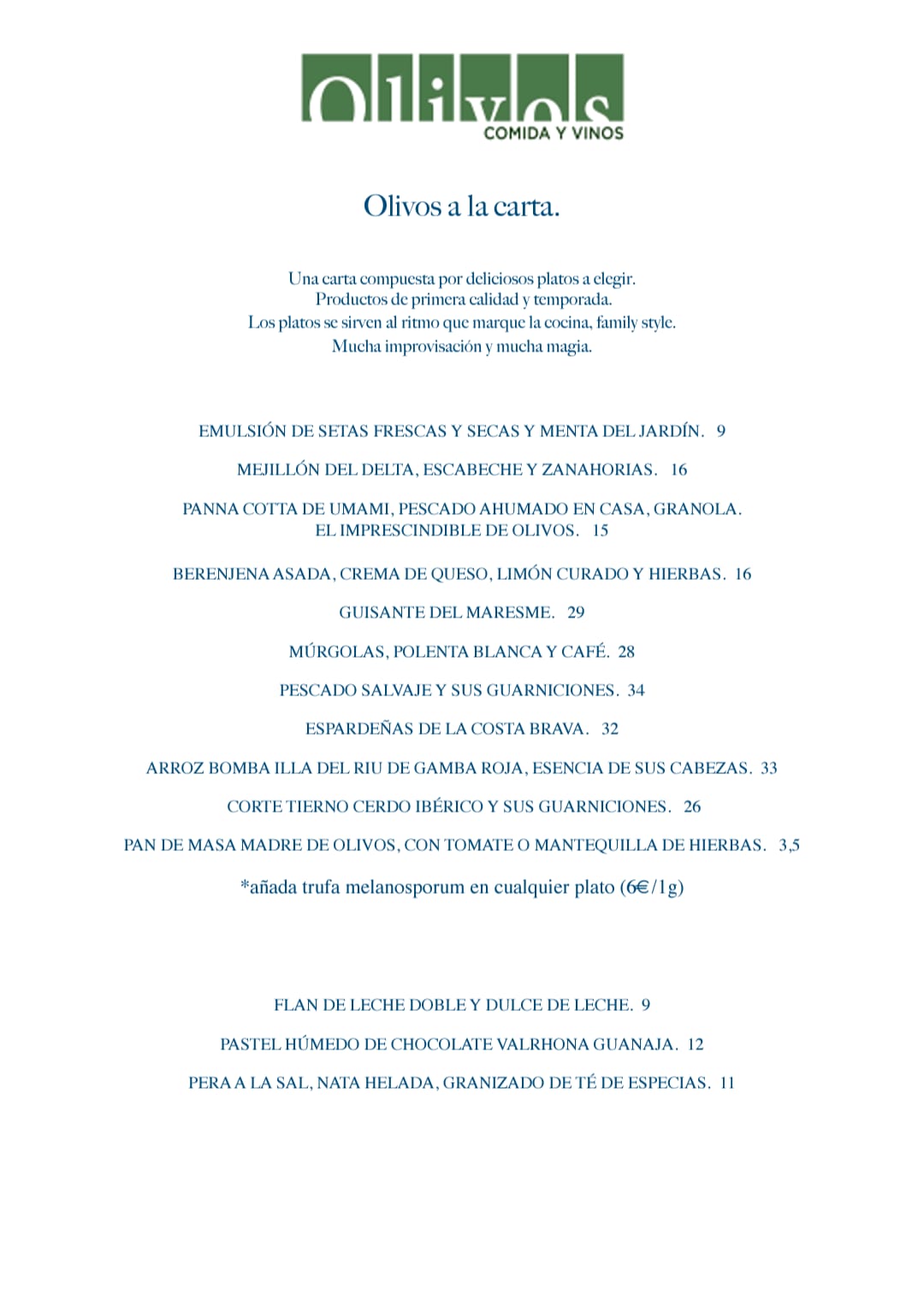 Una carta compuesta por deliciosos platos a elegir. Productos de primera calidad y temporada. Los platos se sirven al ritmo que marca la cocina, al estilo familiar. Mucha improvisación y mucha magia.
